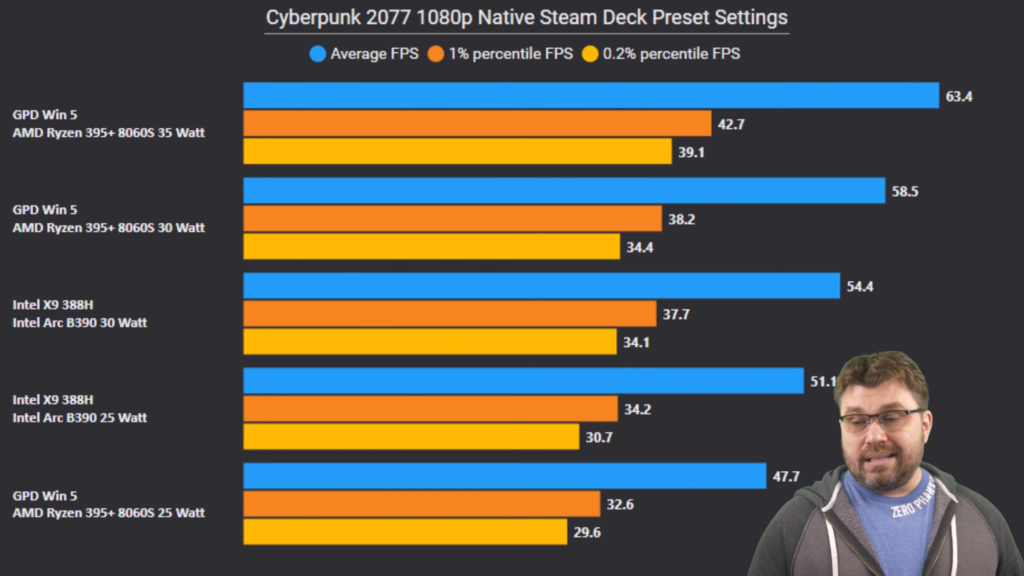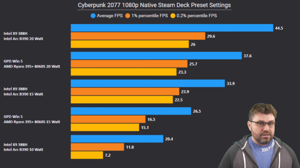 20Wでの運用ではCore Ultra X9 388Hが最も優れた結果を出しており、Cyberpunk 2077をSteam Deck向けプリセットで1080p出力させても45fps程度を発揮し、Ryzen AI Max+ 395に対して18%優れる結果になっています。