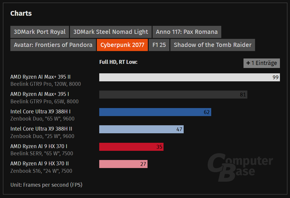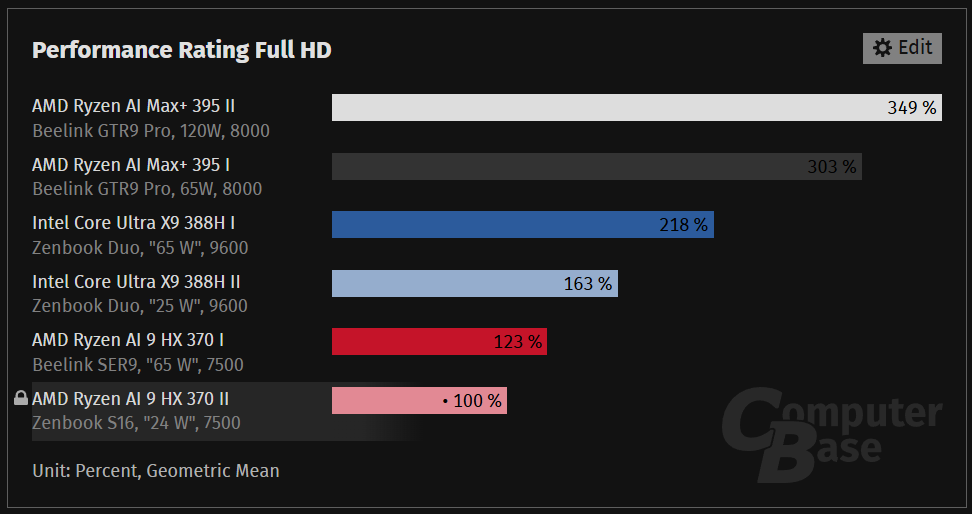 ComputerBaseがまとめた1080p解像度におけるベンチマークでは、Core Ultra X9 388Hは競合となるRyzen AI 9 HX 370に対して、25Wでの動作では163%、最大性能である65W動作時には218%と2倍を超える性能を発揮するなど、驚異的な結果となっています。