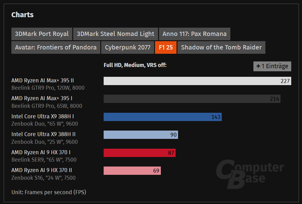 個別のゲームで見ると、比較的重いCyberpunk 2077は1080p解像度でレイトレーシングありの低画質設定の場合、25W動作時で47fps、65W動作なら62fpsと十分プレイ可能な領域に達しています。また、F1 25では1080pの中画質設定で25Wで90fps、65Wで143fpsとなっており、高画質設定でプレイしても60fps以上を出せる水準にあることが明らかになっています。