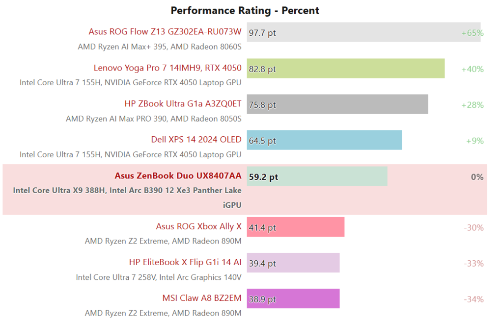 NotebookCheckのベンチマークでもCore Ultra X9 388Hは高い性能を示しています。ベンチマークの記録では、同CPUはGeForce RTX 4050に対して8%劣るレベルにまで迫っており、1世代前のエントリー向けディスクリートGPU並みの性能を持っています。今後の内蔵GPUの性能向上次第では、エントリー向けディスクリートGPUが本格的に市場から駆逐される可能性もあるレベルに達しています。