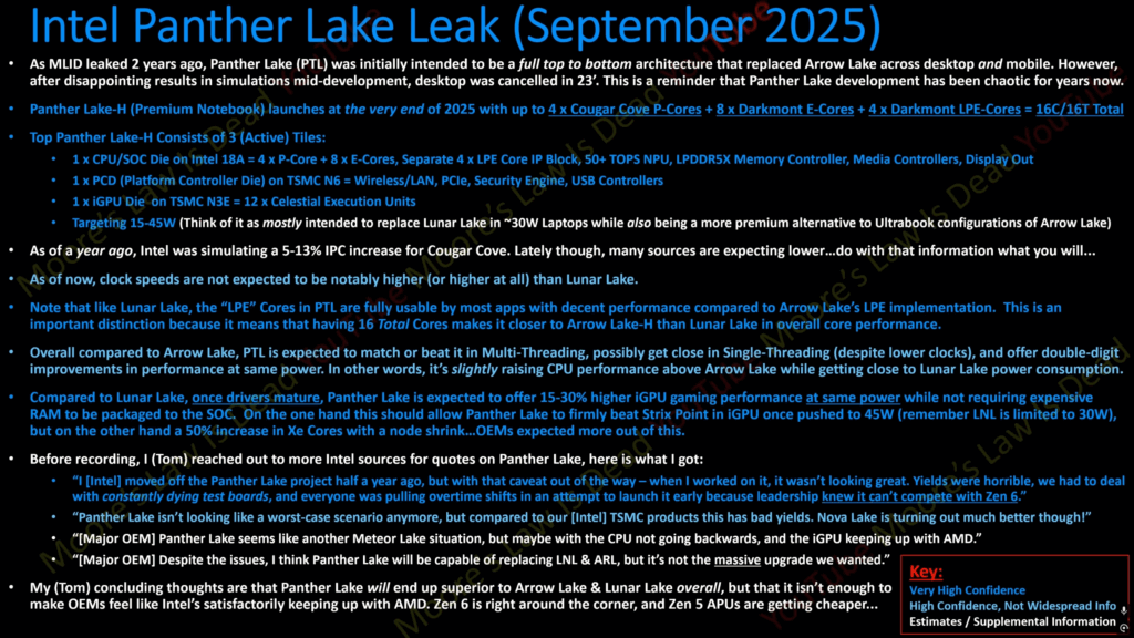 そんなPanther Lakeですが、リーカーのMoore's Law is Deadから現時点で判明しているCPUやGPU性能、開発状況と歩留まり、そしてOEMからの前評判などが明らかになっていますが、性能面では一長一短で、OEMからの期待値はあまり高くない様子が明らかになっています。