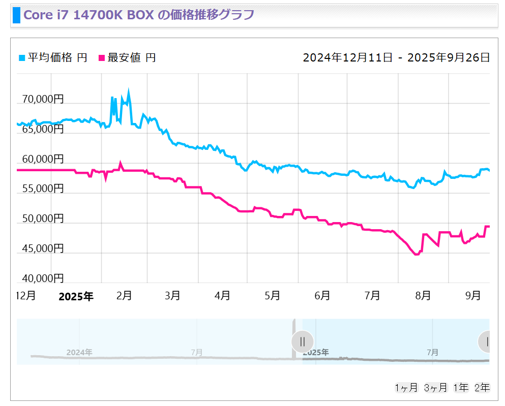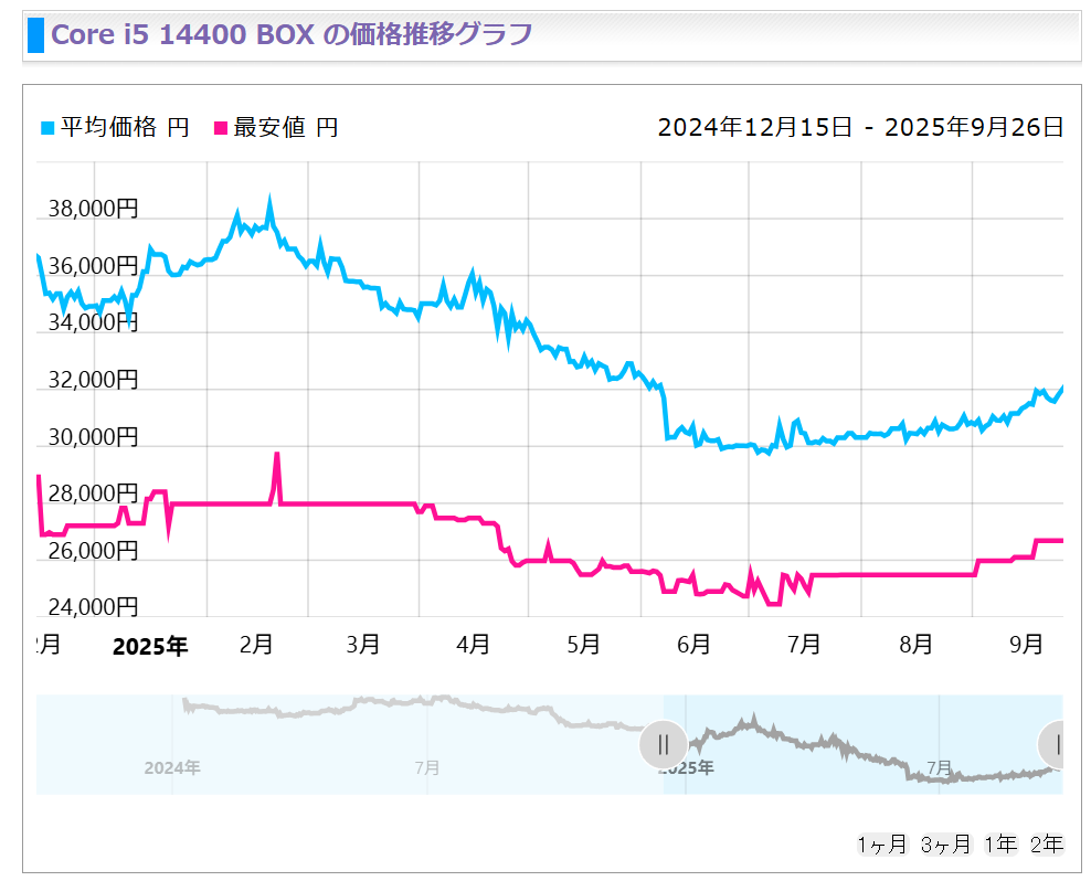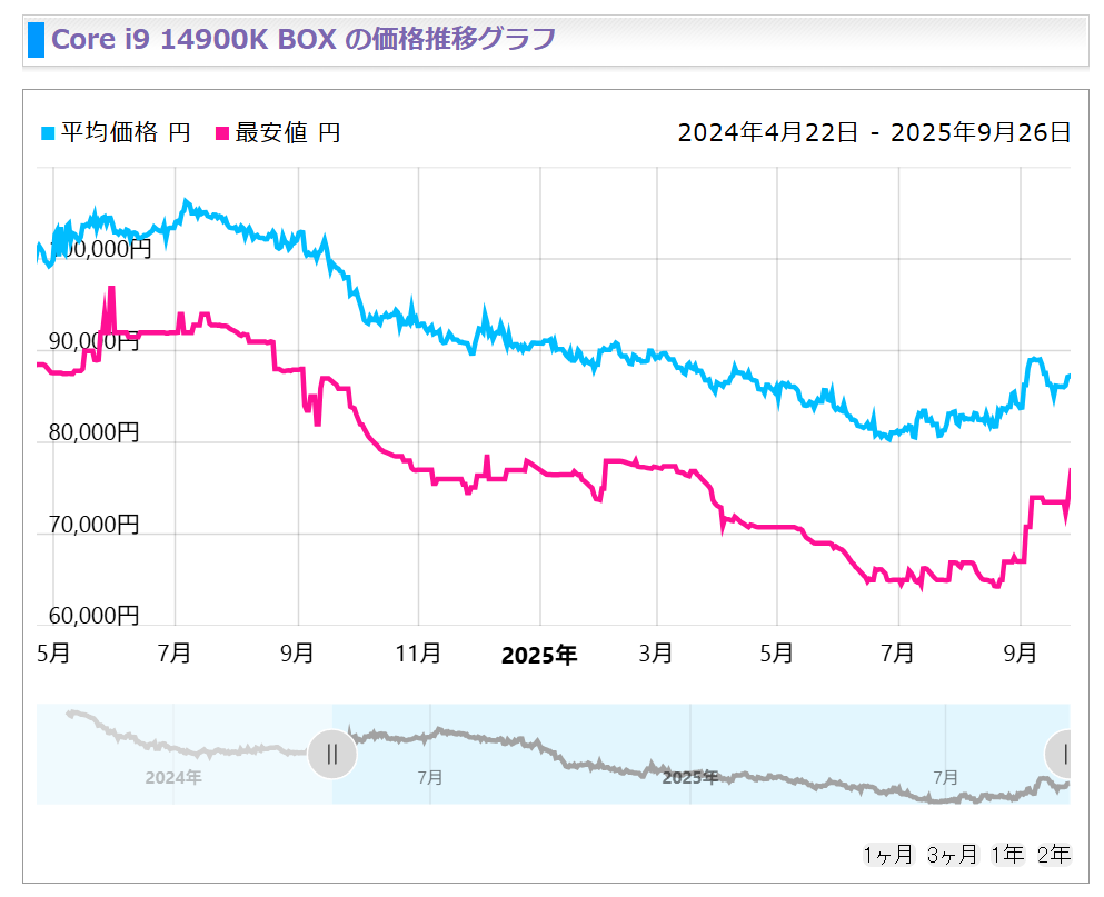Intelの計画では値上げは2025年第4四半期、つまり早くても10月以降出荷分から適用されると見られていますが、Raptor Lakeシリーズが世界的に供給不足に陥り始めているためなのか、特にCore i9-14900Kでは夏以降、日本でも徐々に値上げされていることが判明しています。また、アッパーミドルレンジのCore i7-14700Kも徐々に平均販売価格が上がり始めているほか、エントリー向けとして人気のCore i5-14400も同様の動きを見せています。