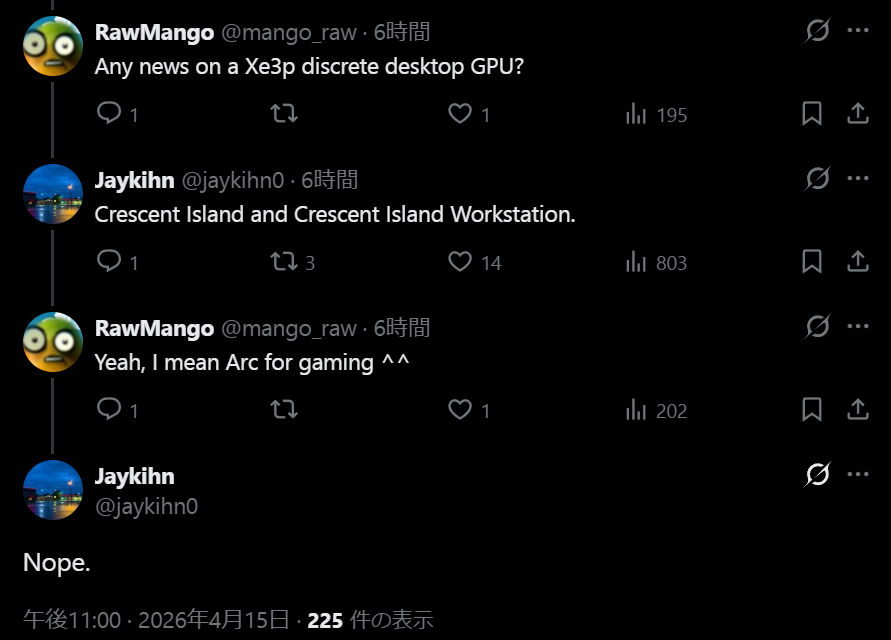 リーカーのJaykihn氏によると、次世代のXe3PアーキテクチャーではCrescent Islandと呼ばれるディスクリートGPUが計画されているものの、現時点で確認されている製品はAI推論向けとワークステーション向けの2つのみで、ゲーミング向けのArc製品は含まれていないとのことです。