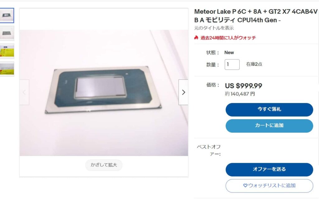 eBayに出品されたのは薄型ノートPCなどに搭載される事を想定したMeteor Lake-Pで、CPU構成は6P+8E構成のモデルになっており、実際にComputex2023のデモ機に搭載されていた16コア22スレッドモデルと全く同じ構成のCPUと見られています。出品されているMeteor Lake-Pについては、価格は$999.99、日本円では14万円ほどで在庫は2個ほどあるようです。ただ、このMeteor Lake-PはノートPC向けという事でCPUとマザーボードとの接続はBGAで行われるため、はんだ付け作業が必要な上、互換性のあるマザーボードが市場には出回っていない事から動作させることは困難と言えます。