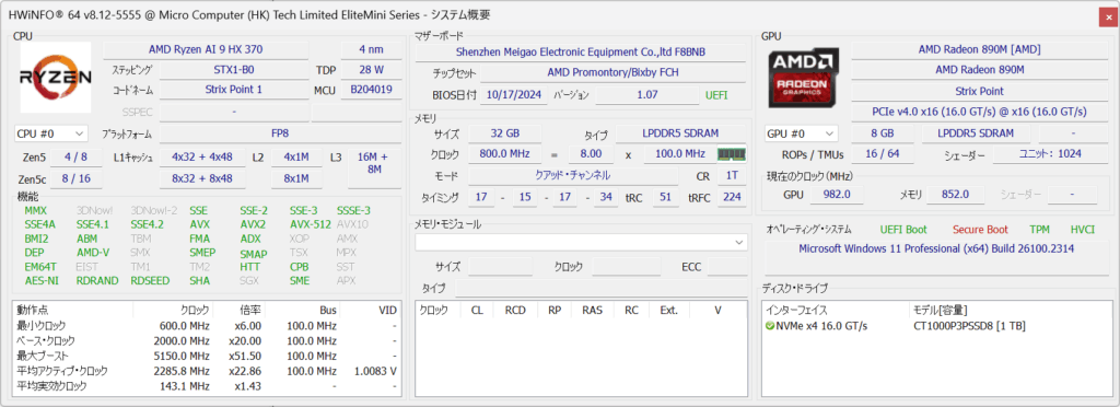 | メモリー | LPDDR5x 7500 GT/s = 32GB |