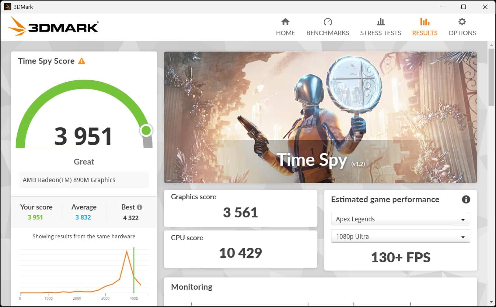 3DMark TimeSpyにおいてはGraphics Scoreが3561ポイントを記録しており、デスクトップ向けのGeForce GTX 1650並みの性能を発揮しています。また、ノートPC向けグラフィックカードで言うとGeForce RTX 2050などにも迫っており、CPU内蔵GPUとしては非常に高い性能と言えます。