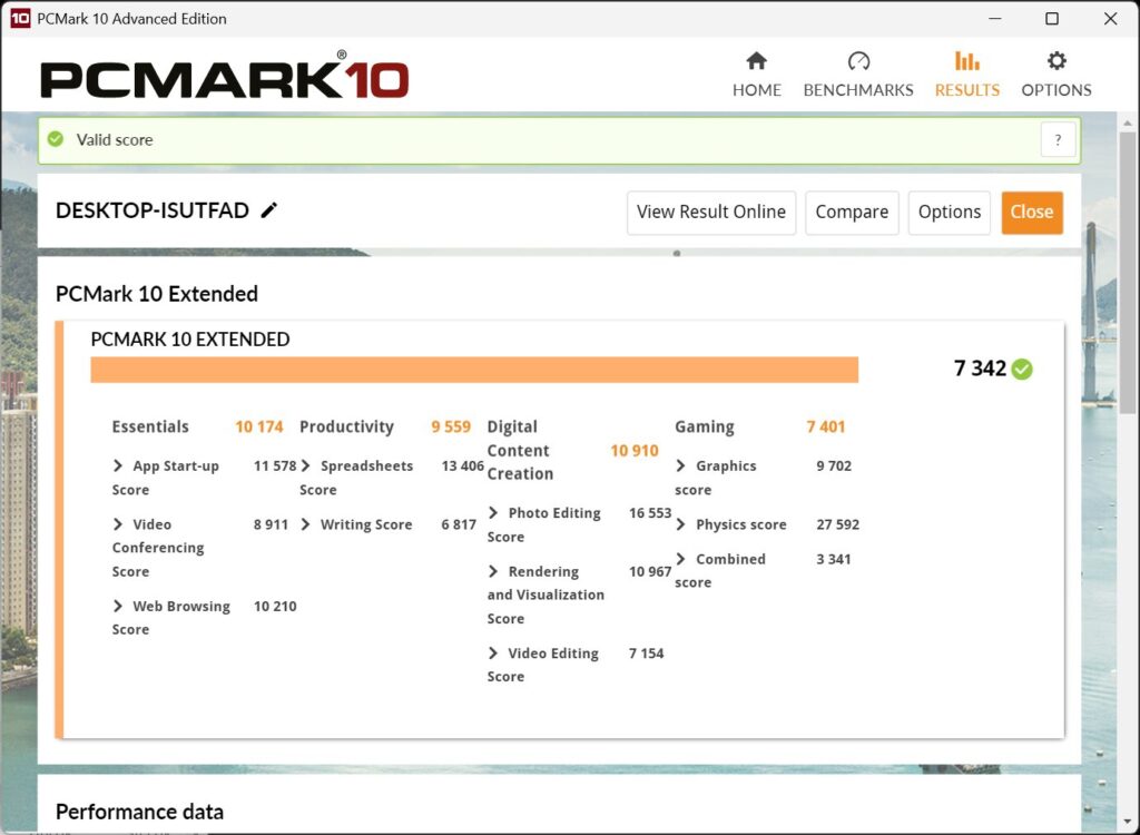 PCMark10においては合計7342ポイント記録されています。