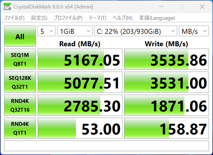 内蔵されているSSDはCrucial P3 Plus CT1000P3PSSD8と呼ばれるPCIe Gen 4対応の1TB NVMe SSDを搭載しています。このSSDは公称値が読み取り5000 MB/s、書き込み3600 MB/sとなっていますが、ベンチマークでは読み取りが5167 MB/s、書き込みが3536 MB/sを記録しているため公称値通りの性能であり、速度としても高速であるためゲームのローディングも高速です。