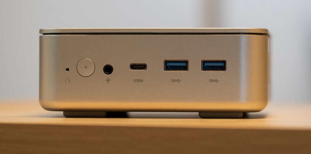筐体とインターフェース類との隙間などは一定で品質は良いと言えます。前面はUSB4とUSB3.2 Gen2 Type-Aを2口、3.5mmジャックと電源ボタンがあります。