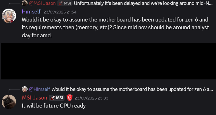 MSIのDiscordにて、近いうちに発売予定のMSI製マザーボードについて、コミュニティー参加者が800シリーズマザーボードのZen 6対応などの将来性について質問を投げかけたところ、MSI従業員から「将来的に登場するCPUへの対応準備は行われている」という回答が得られたようです。