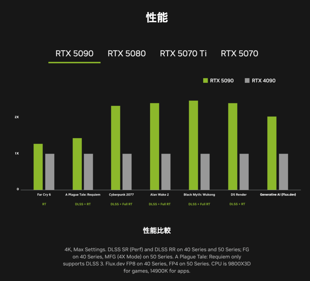 性能に関して、NVIDIAが公表している値は限られていますが、RTX 5090はRTX 4090に対してFar Cry 6のRTのみ利用の場合は1.1~1.15倍程度の向上が見られるとのことです。これはRTX 3090 TiとRTX 4090に近い性能向上幅になっています。