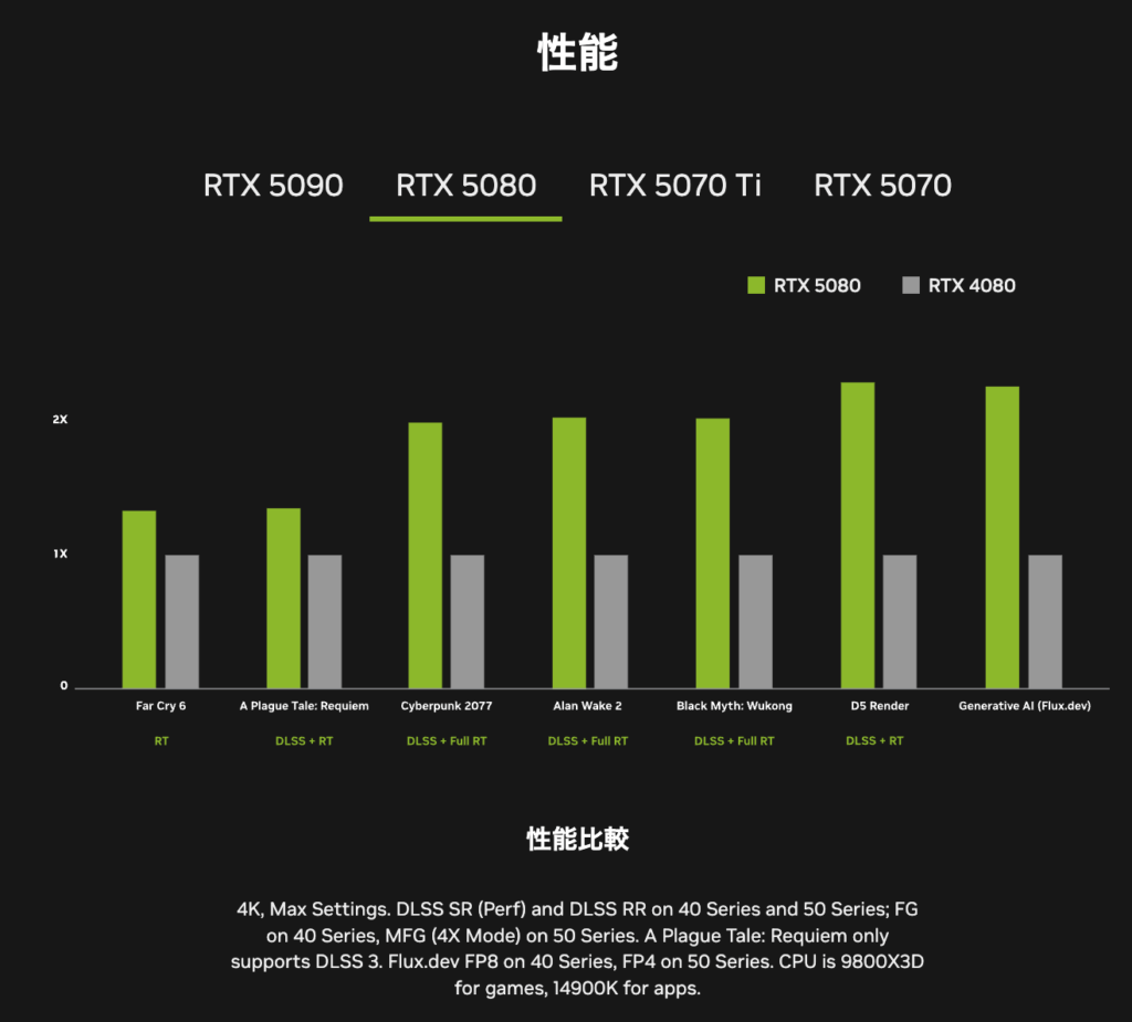 RTX 5080ではFar Cry 6のRTのみはRTX 4080に比べて1.2倍程度向上する見込みで、RTX 4090を超えるレイトレーシング性能を発揮すると見られています。
