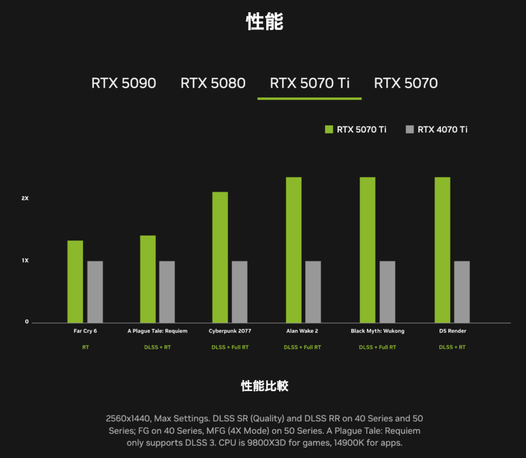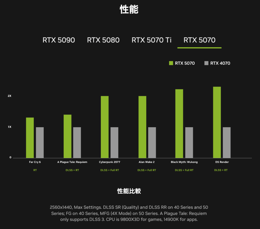 アッパーミドルレンジのRTX 5070 Tiに関してはRTX 4070 Tiに対して1.25倍ほどの向上が見られるため、1440p解像度であればRTX 4080 SUPERかRTX 4090相当と言えそうです。RTX 5070はNVIDIAは発表会でRTX 4090相当の性能があることを明らかにしていましたが、これはDLSS4含めたパフォーマンス値であると推測されます。そのため、NVIDIAが公開している性能グラフによるとRTX 5070はRTX 4070の1.2倍程度で純粋なグラフィックス性能はRTX 4070 Ti SUPERに近いと考えられます。