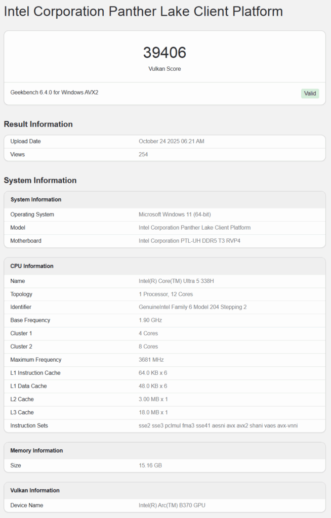 Core Ultra 5 338Hに内蔵のArc B370のGeekbenchはVulkan APIで計測されており、スコアは39,406ポイントを記録しています。