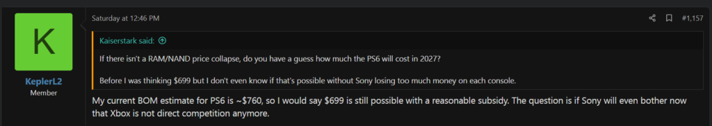こうした中、AMD関連のリークで定評のあるKepler_L2氏がPS6の製造原価について具体的な推定値をNeoGAF掲示板で明らかにしています。