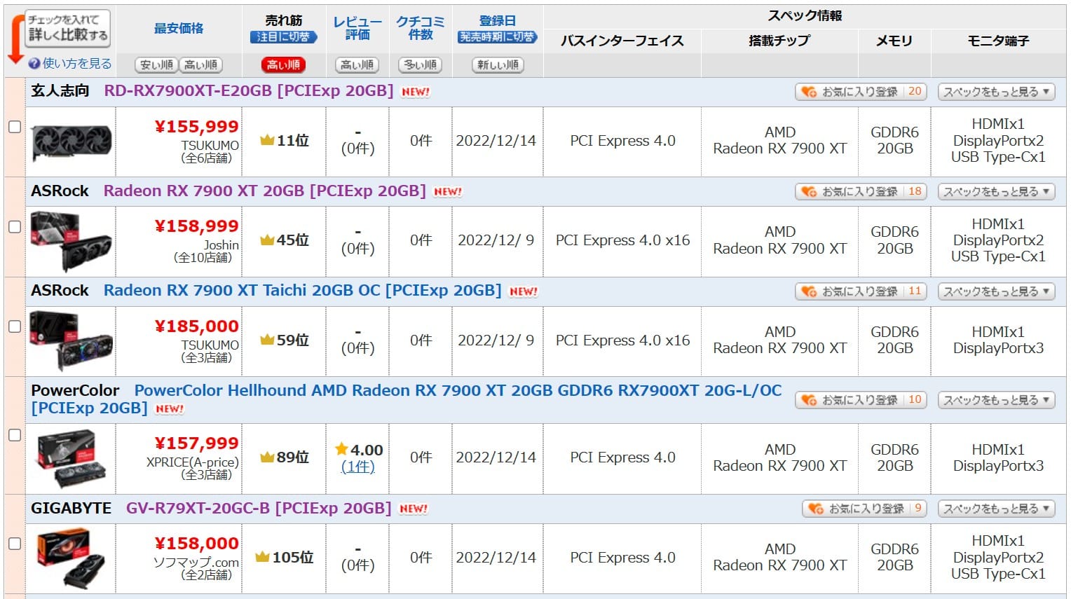 日本においてはRadeon RX 7900 XTは発売時の最廉価モデルは玄人志向のRadeon RX 7900 XT(リファレンスモデル)で、価格は156,800円で販売が行われていました。