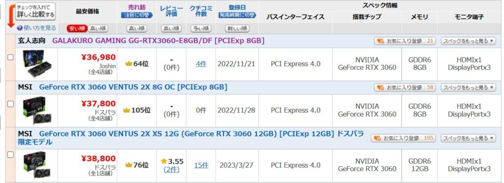 AMDのRadeon RX 6600 XTについては過去最安値は3.4万円でしたが、直近では3.2万円にまで値下がりしています。また、取り扱われているモデルも減少傾向に転じています。