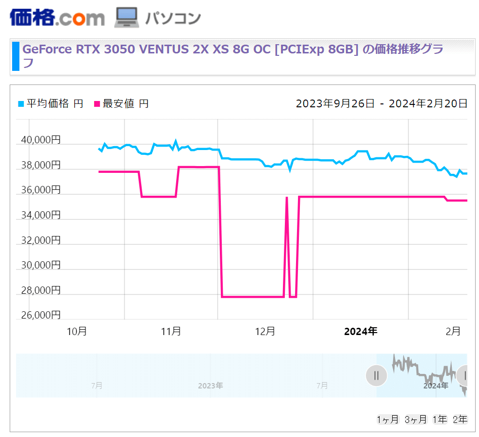 ただ、そんなRTX 3050 8GBは2023年末で製造中止されており、それ以降はRTX 3050 8GBの価格はジワジワ値上がりし、現在の3.5万円と言う価格に落ち着いています。