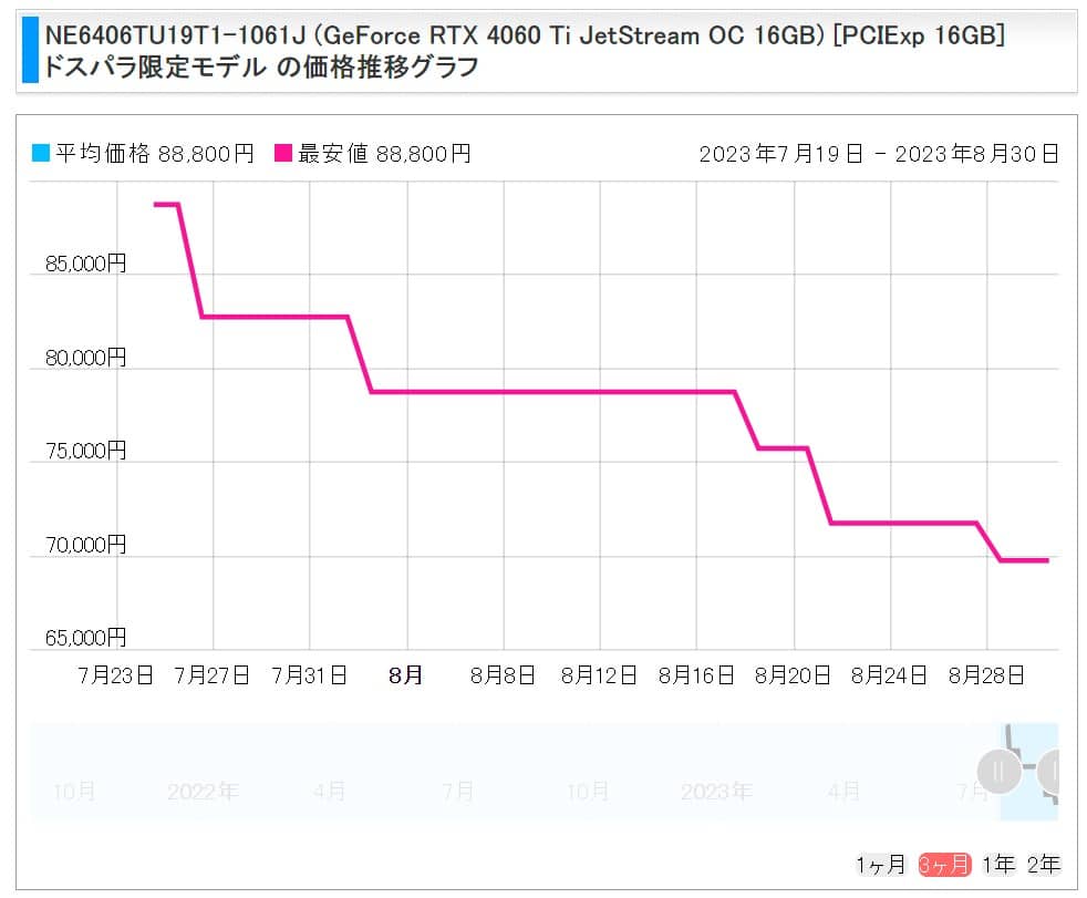 そんなGeForce RTX 4060 Ti 16GBは発売日には税込み88,800円と言うRTX 4070の販売価格を超える値段での販売が行われたためほとんど売れず、発売2週間で78,800円と1万円の値下げが行われ、そこからも継続的に値下げが行われています。その結果、なんと発売から1.5か月程度が経過した時点で既に2万円に迫る値下げが行われてしまっているようです。