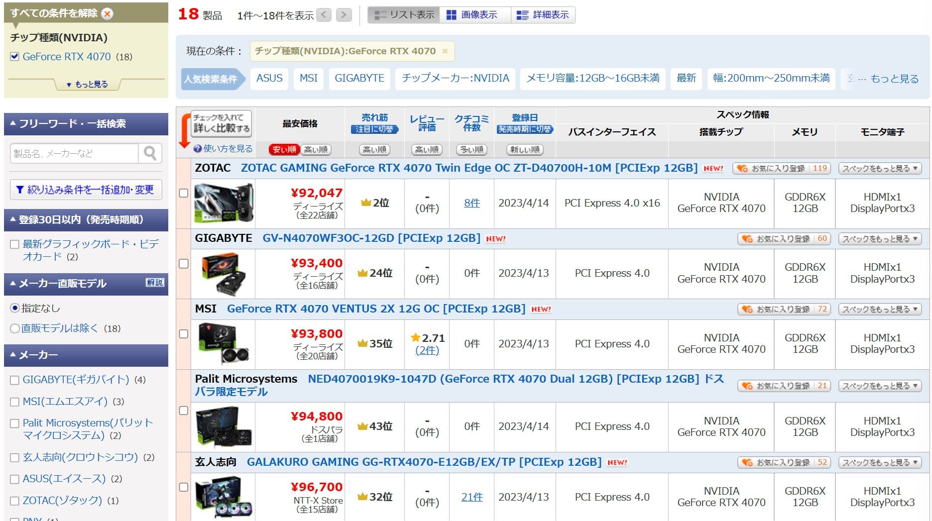 GeForce RTX 4070の価格は9.2万円にまで下落。9万円を切る価格も迫る?