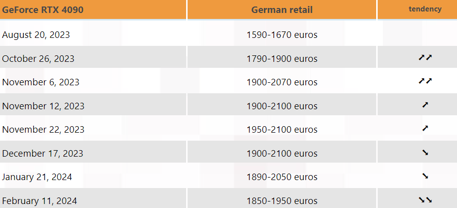 この観察はドイツ市場に基づいています。現在の価格は8月の時点で最も手頃なRTX 4090がわずか€1,590で手に入れられた時ほど低くはありませんが、傾向は明らかです。現在、SKUは€1,839-€1,950でリストされており、これは確かに1月(€1,890-€2,050)よりもはるかに低い価格です。