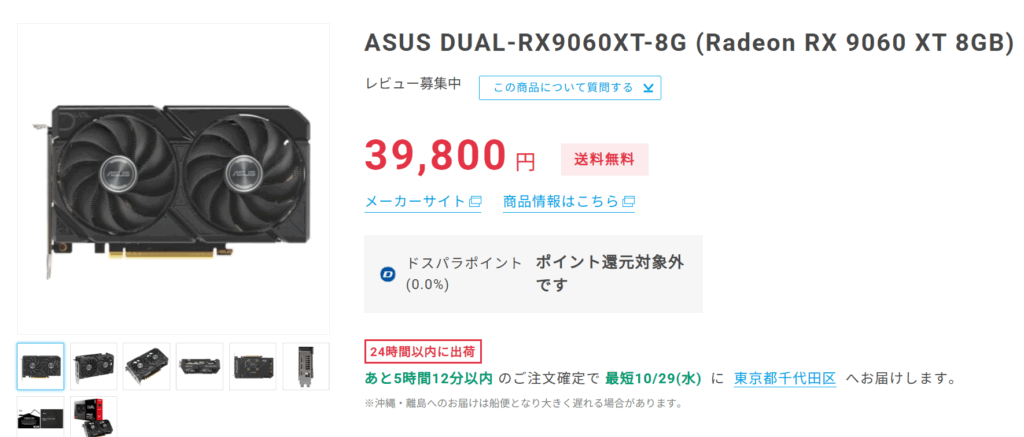 Radeon RX 9060 XTの中でVRAM容量を8GBしか持たないモデルも安値での販売が行われています。ASUS製のRadeon RX 9060 XT 8GB DUALに関しては、現在39,800円で販売されていることが確認されています。