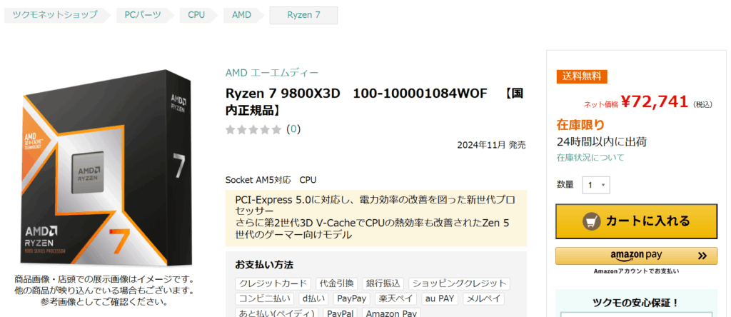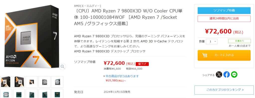 AMD製CPUの正規取扱店で販売されているRyzen 7 9800X3Dの多くが7万円台前半で販売され始めており、セールなどの表記もないことから、数量限定でもないようです。