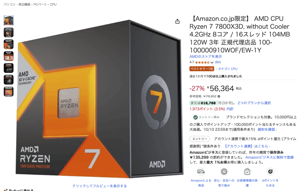 そんなRyzen 7 7800X3Dですが、Amazonにて3年のメーカー保証が付与されている正規代理店品が税込み56,364円で販売されています。