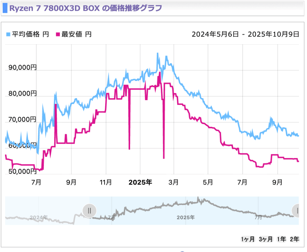 Ryzen 7 7800X3Dの価格推移は、Zen 5世代のRyzenが発売されて以降ジワジワと値段が上がっていました。Ryzen 7 9800X3Dの発売、そして同CPUの品薄や競合のArrow Lakeのゲーミング性能が優れないことが明らかになると、Ryzen 7 7800X3Dにも人気が集まり、一時は8万円を超える価格で販売されていました。