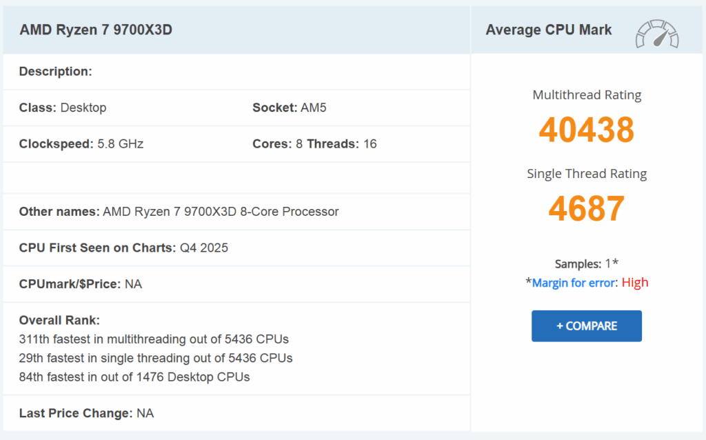 AMDは2026年上半期までに複数の新しい3D V-Cache搭載のRyzen 9000X3Dシリーズを発売する見込みです。今回、PassMarkベンチマークのデータベースに未発表のRyzen 7 9700X3Dと呼ばれるCPUが登録されていることが判明しました。ベンチマーク結果によると、このCPUは現行のRyzen 7 9800X3Dとほぼ同等の性能を発揮しています。