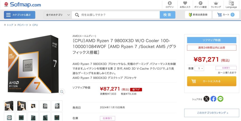 Ryzen 7 9800X3Dの値下げが行われているのは正規品を取り扱う量販店の一部に留まっており、6月3日時点ではソフマップ、ドスパラなどでは値下げ前の93,800円から6,529円値下げとなる、87,271円での販売が行われています。