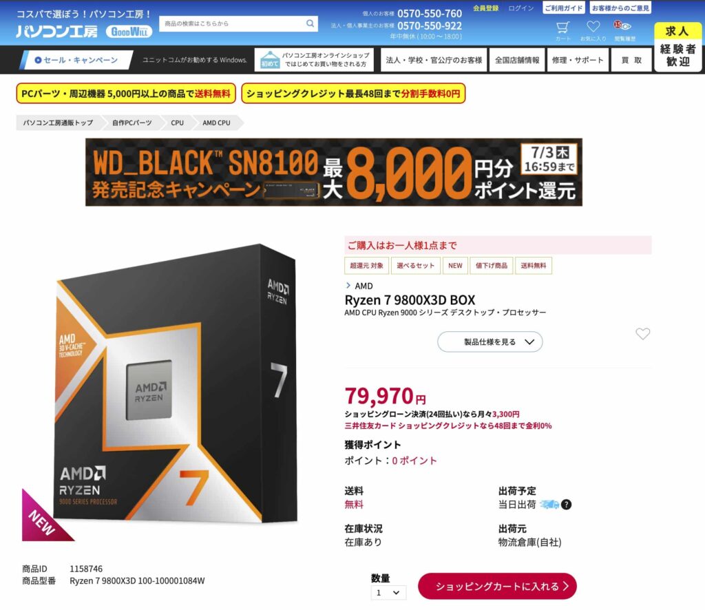 ただ、すでに需要が一巡したことや、PCパーツの価格に影響を与える為替レートが145円台で安定してきていることからかRyzen 7 9800X3Dの販売価格が大きく値下がりし、節目である8万円を切り、7万円台で販売され始めています。