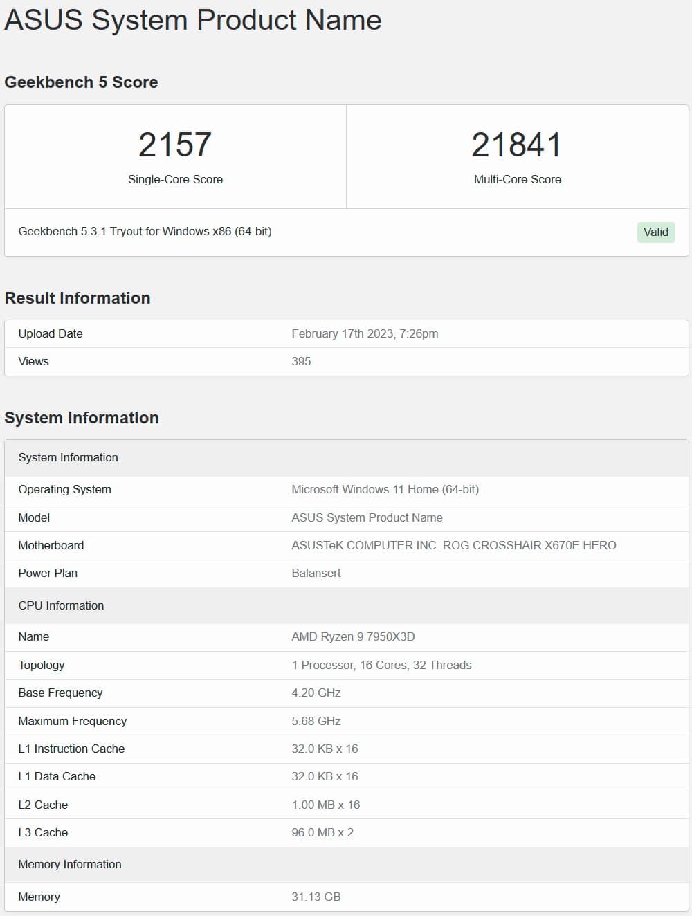 Geekbenchに掲載されたRyzen 9 7950X3DはASUSのROG CROSSHAIR X670E HEROと呼ばれるハイエンドマザーボードが用いられてベンチマークが行われています。