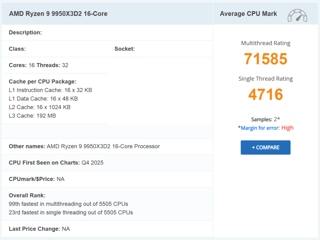 PassMarkベンチマークでは、Ryzen 9 9950X3D2はマルチスレッドスコア71585を記録し、Ryzen 9 9950X3Dの70154から約2%向上しています。一方、シングルスレッド性能は100MHz低いブーストクロックの影響でやや低下しています。