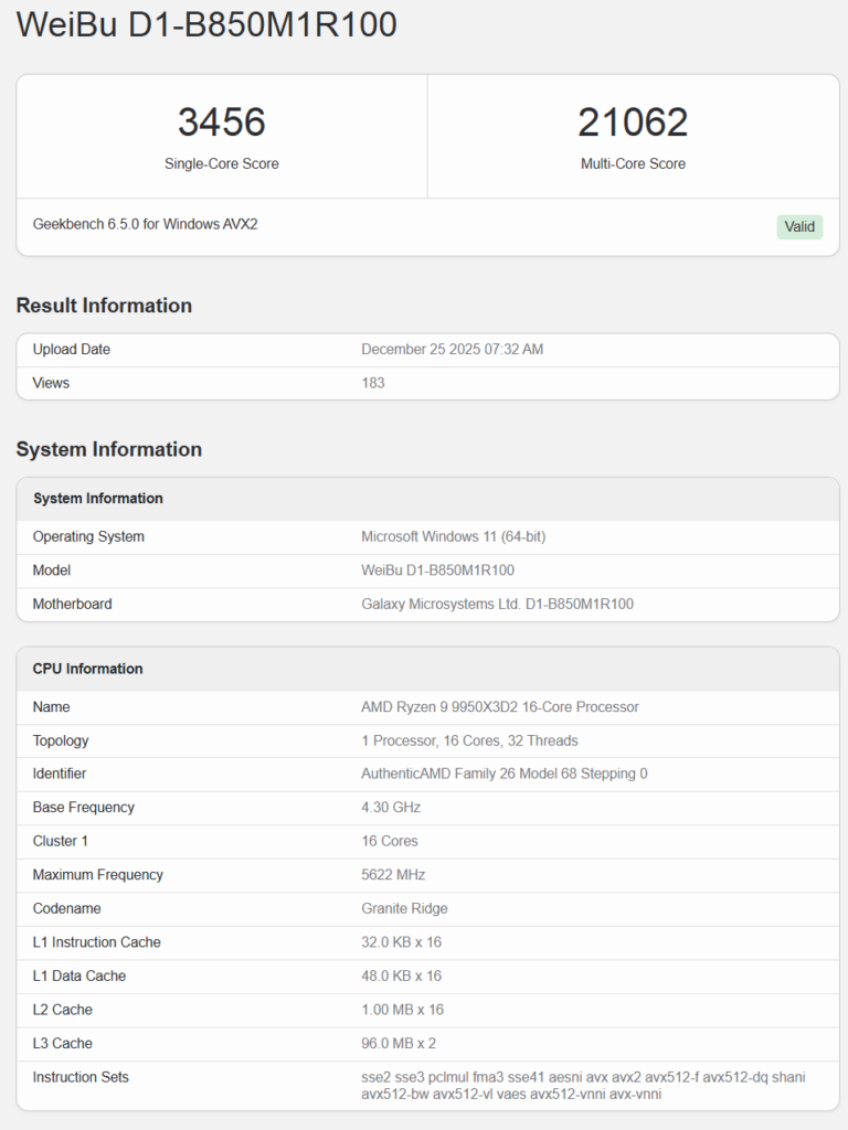 Geekbench 6.5.0でのテスト結果も公開されています。テスト環境はGALAX製B850マザーボードに96GBのDDR5-4800メモリーを搭載した構成となっています。