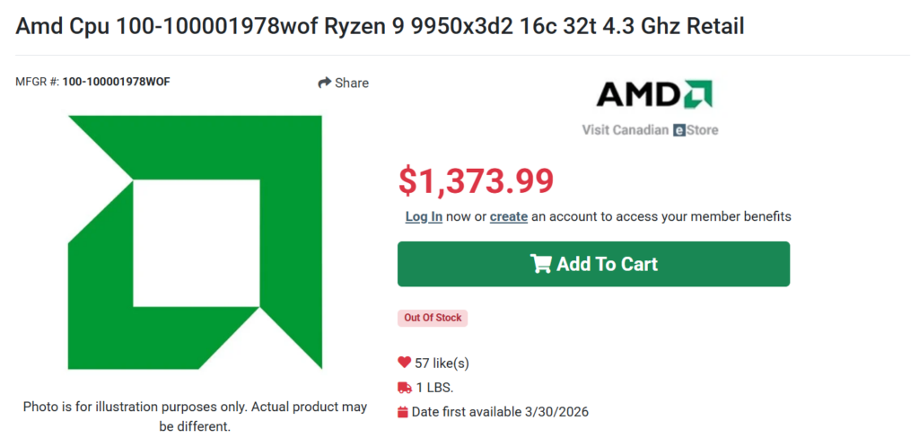 カナダのPC-Canada.comやShopRBCでは約1,375カナダドル(約984米ドル/約15.7万円)、イギリスの小売店ではVAT抜きで約15.3万円前後の価格が確認されています。いずれも発売前のため購入はできず、仮の価格が設定されている可能性があります。下位モデルのRyzen 9 9950X3Dが699ドル(約11.2万円)で発売されたことを踏まえると、Dual Editionは少なくとも799ドル(約12.8万円)以上になると見込まれています。