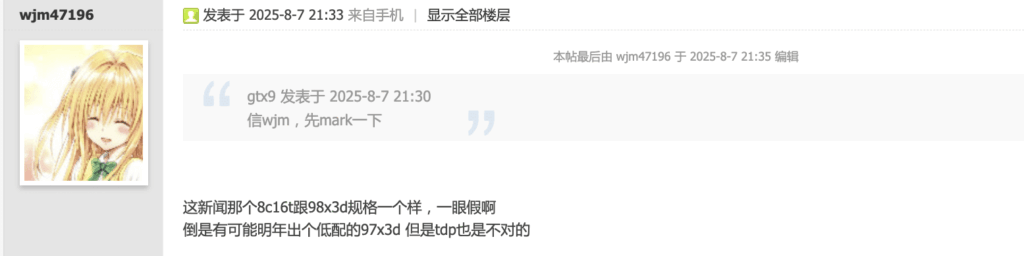 デュアルX3Dのリークが話題になった際、Ryzen 7 9800X3Dと同じ8コア16スレッド構成の3D V-Cache搭載モデルが登場する可能性にも触れられていました。wjm47196氏は、このCPUについては実際に存在する可能性を示唆しており、TDPはリーク内容よりも低く設定されるものの、Ryzen 7 9800X3Dの廉価版として「Ryzen 7 9700X3D(仮称)」として登場する見込みがあると述べています。