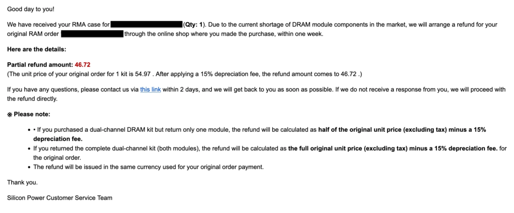 ただ、Silicon Powerからは交換は受け付けてもらえず、返金対応しか受け付けてもらえなかったとのことで、さらに返金に際しては減価償却として15%差し引いた額しか返金しないという対応が行われた事を明らかにしています。