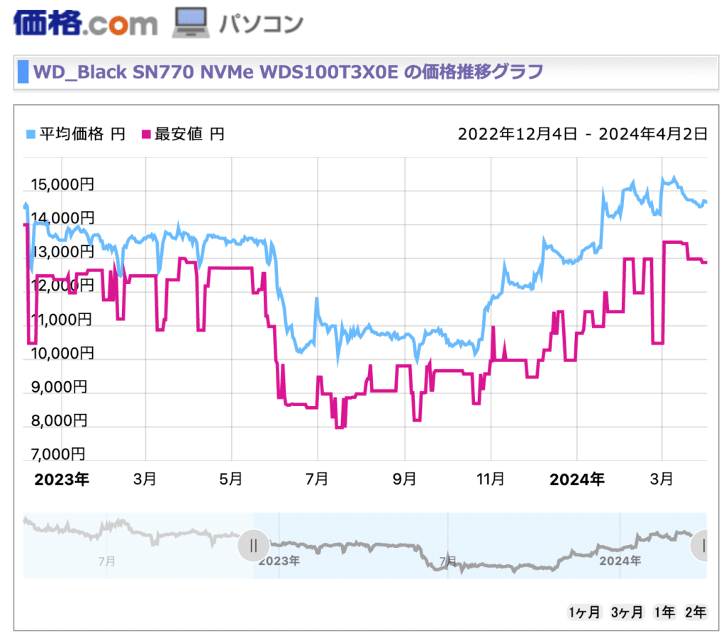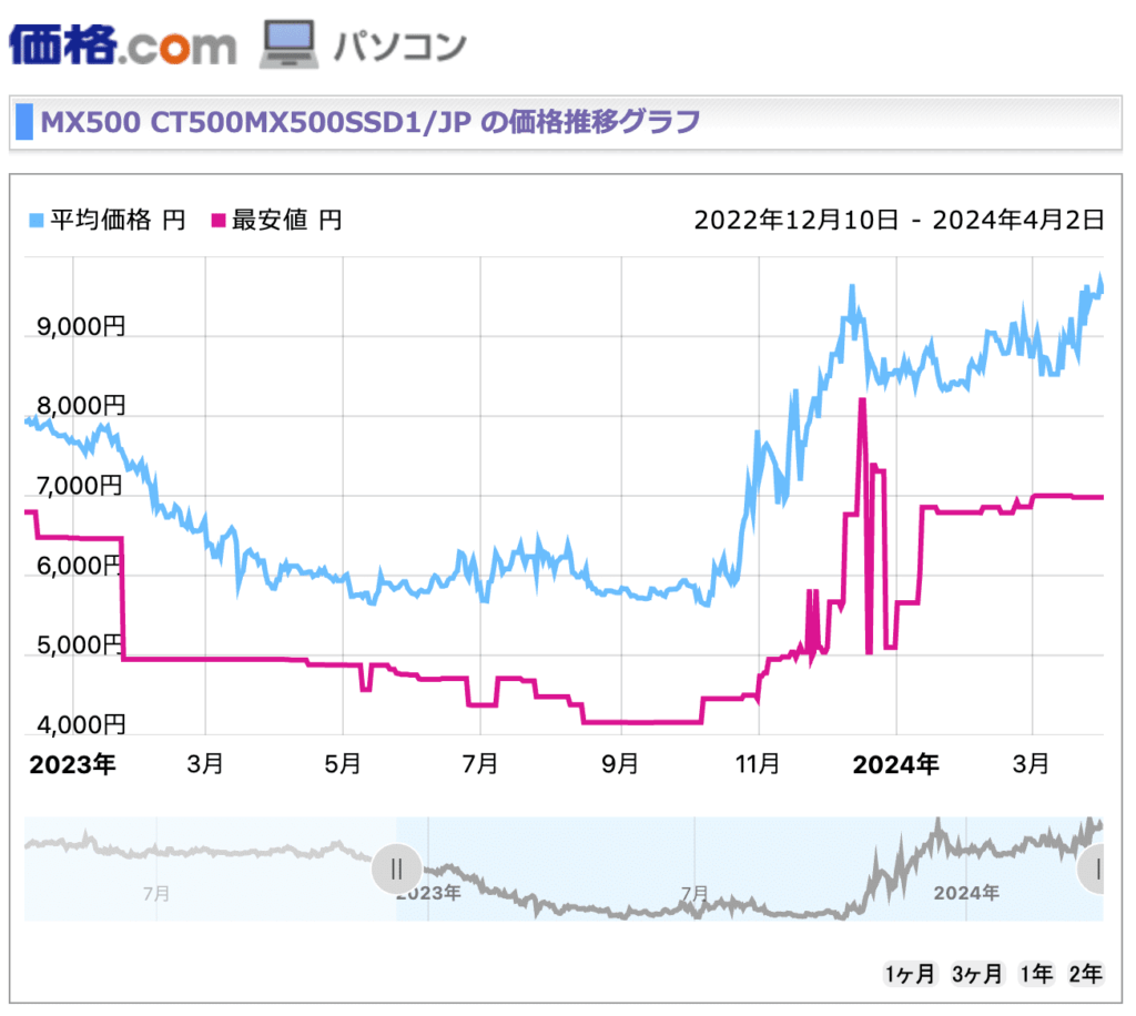 SSDについてはPCIe Gen 4対応のNVMe SSD 1TBモデルでも1万円を下回るような金額で買えていましたが、今では値上がりが続き1万円弱、下手したら1.5万円程度払わないと買えないなど価格が実感できるほどに上がっています。今後もこの値上がりトレンドは続くと調査会社では予測しているため、SSDの容量を増やすことを検討している人は早めに購入に踏み切ったほうが良さそうです。