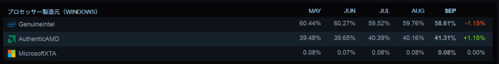 Valveが毎月公開しているSteamハードウェア調査において、AMD製CPUのシェアが8月の40%台から9月には41.31%に達していることが明らかになりました。一方で、Intelのシェアは下落が続くなど苦戦している状況です。