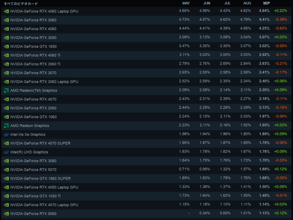 Steamは2025年9月に集計されたSteamハードウェア調査の結果を公表しました。グラフィックカードのシェアにおいて、ノートPC向けのGeForce RTX 4060が首位をキープし、2位にRTX 3060、3位にRTX 4060と、トップに位置するグラフィックカードのランキングには大きな変動は見られていません。