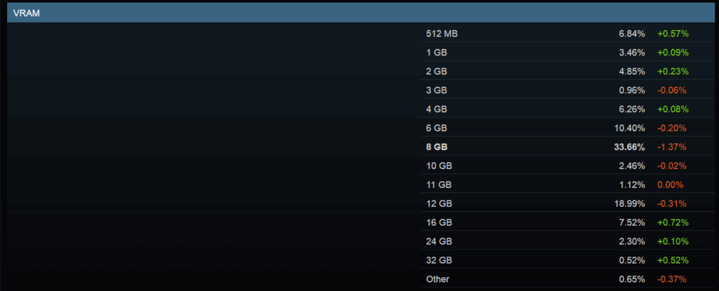 一方で、16GBのVRAMを搭載するPCのシェアが+0.72%と大きく増えていることから、多くのユーザーが8GBのVRAMを持つ製品からの買い替えを行っているほか、新たに購入されるグラフィックカードでは16GB以上のVRAMを求める傾向にあることが判明しています。