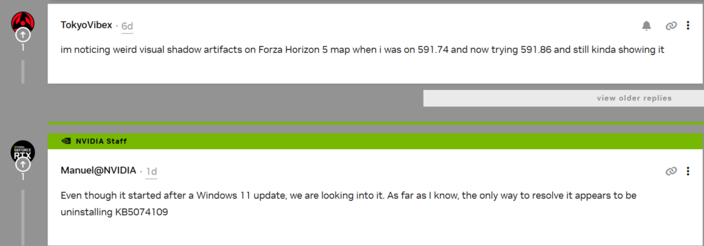 NVIDIAの公式フォーラムやMicrosoftのFeedback Hubに寄せられた報告によると、KB5074109適用後にForza Horizon 5などのゲームでマップ上に影のアーティファクト(四角形のグラフィック乱れ)が表示されるといった不具合のほか、ゲーム起動前やプレイ中の黒画面が発生し、プレイできないという報告が寄せられています。