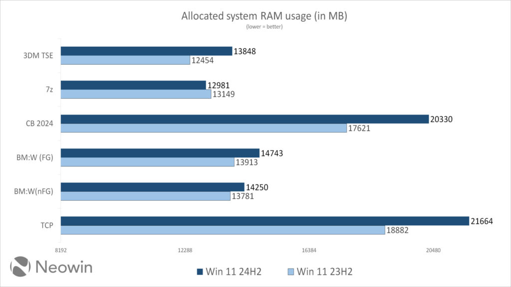 また、パフォーマンスが低下するなど見えやすい変化のほかに24H2は23H2に比べてメモリー使用量がかなり増えてしまっているようで、3DMark Time Spy Extreme時は23H2時は12.5GBだったものが13.8GBに増えていたり、Cinebench R23では17.6GBから20.3GBへ大幅に増えていることが明らかになっています。このメモリー使用量の大幅増加については使用可能なメモリーは可能な限り使うなど管理方法の変更に伴うものもあるかもしれませんが、現状、ゲーミングやCPUパフォーマンスの低下などが見られていることからあまり意味がある変更とは言えず、これもアップデートをためらう一つの要因となりそうです。