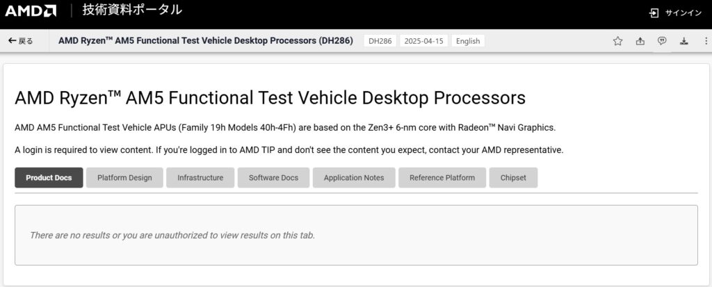 なお、このAPUに関してはどこかのタイミングで発売が中止され、お蔵入りとなっているはずですが、技術資料ポータルを見ると最近も2025年4月15日に情報の一部が更新されているようですのですが、詳細情報が見られないためその内容については不明です。ただ、エントリー向けモデルとしてラインアップされていたソケットAM4もDDR4の生産が中止されるなど販売継続がいつまで続けられるかは不明である一方で、ソケットAM5向けにはエントリーモデルがラインアップされていないことから、もしかしたらZen3+RDNA2で構成されたRembrandtをソケットAM5向けのエントリーモデルとして投入するかもしれません。