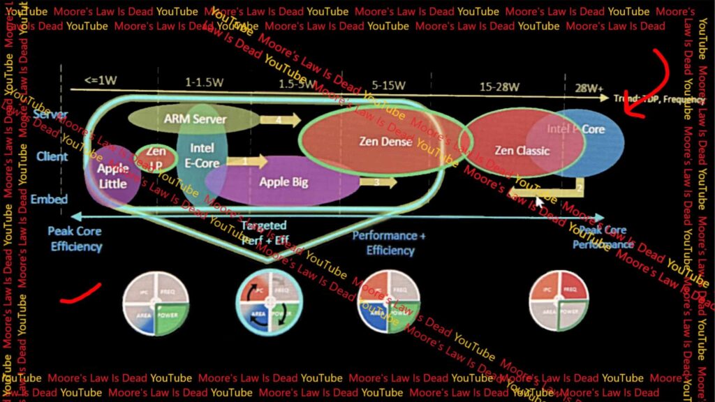 この低電力コアはZen LP(Low Power)と呼ばれており、デスクトップとノートなどクライアント向けにのみ搭載することを想定しているCPUコアになります。そして、このコアはAppleのM系チップセットに搭載されているLittleコアより消費電力が大きい一方で、IntelのE-Coreより低くなる見込みで、レンジとしては1W未満から1.25W程度の消費電力しか使わないなど名前の通り非常に低い消費電力での動作を目指したコアになっています。