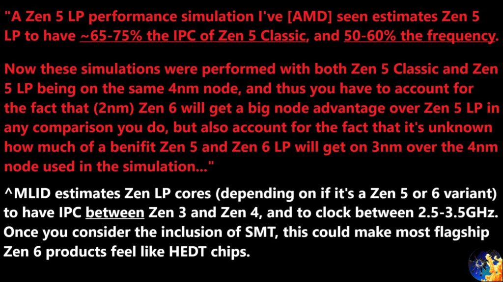 また、Zen 6搭載のデスクトップ向けCPUやMedusa Strixなど一部ノートPC向けAPUにはZen 5 LPがIOD内に搭載されると言われていますが、このZen 5 LPコアでも性能はかなり高めになる見込みで、AMDはデスクトップ向けなどに搭載されているZen 5 Classicに対して7割近いIPCを持ちながら、動作クロックは半分ほどに抑えられるとのことです。また、この想定はZen 5もZen 5 LPも両方とも4nmプロセスを用いた場合であり、実際にZen 6に搭載される3nmプロセスでは消費電力を抑えながらも動作クロック向上が可能となるため、性能はさらに向上する可能性があるとのことです。